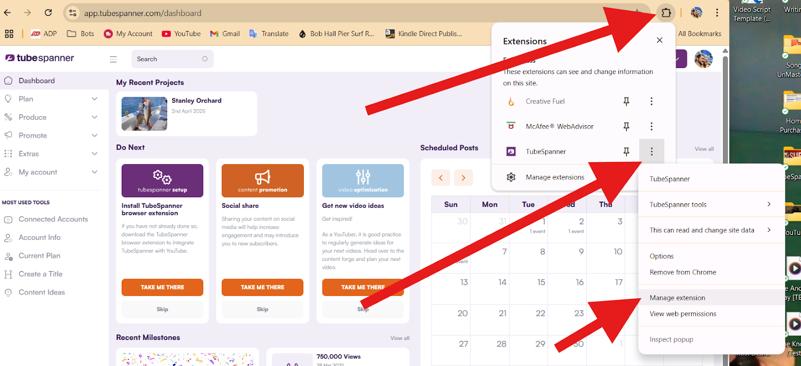 Next you will need to open the options menu for your TubeSpanner extension and select Manage Extension from the following list of options (shown above).